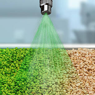 El control reológico de los polímeros sintéticos y las siliconas puede perjudicar a veces la pulverizabilidad. Por esta razón, no se pueden producir patrones de pulverización finos con boquillas de pulverización simples. Los ángulos de pulverización son difíciles de ajustar y de romper. Un patrón de goteo irregular hace que el abono se distribuya de forma desigual sobre el follaje. La dosificación precisa resulta imposible.